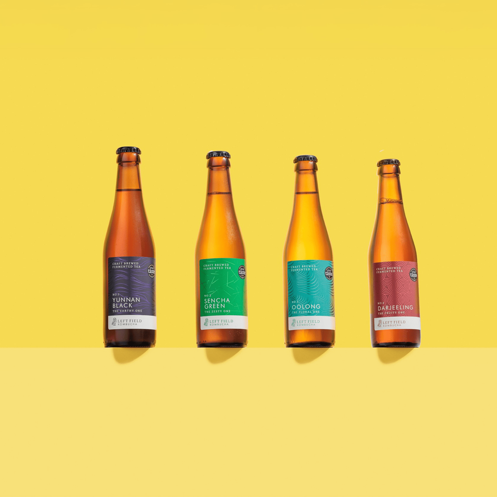 All four Left Field Kombucha ‘Just Tea’ flavours in one case. Our products prioritise high-quality, craft-brewed, ethically sourced tea, allowing the natural flavours to shine through. When brewing kombucha, we only add three things (tea leaves, sugar, and water) to our natural fermentation culture which imparts lots of gut-healthy acids and bacteria. Our award-winning handcrafted drinks are naturally low in calories, and a grown-up alternative to sugary soft drinks.